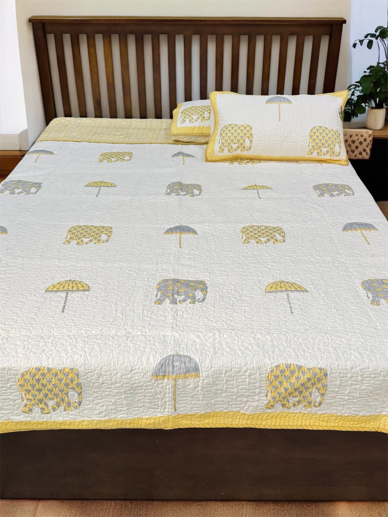 Quilted Handblock printed cotton bedspread/bedcover with 2 pillow covers.