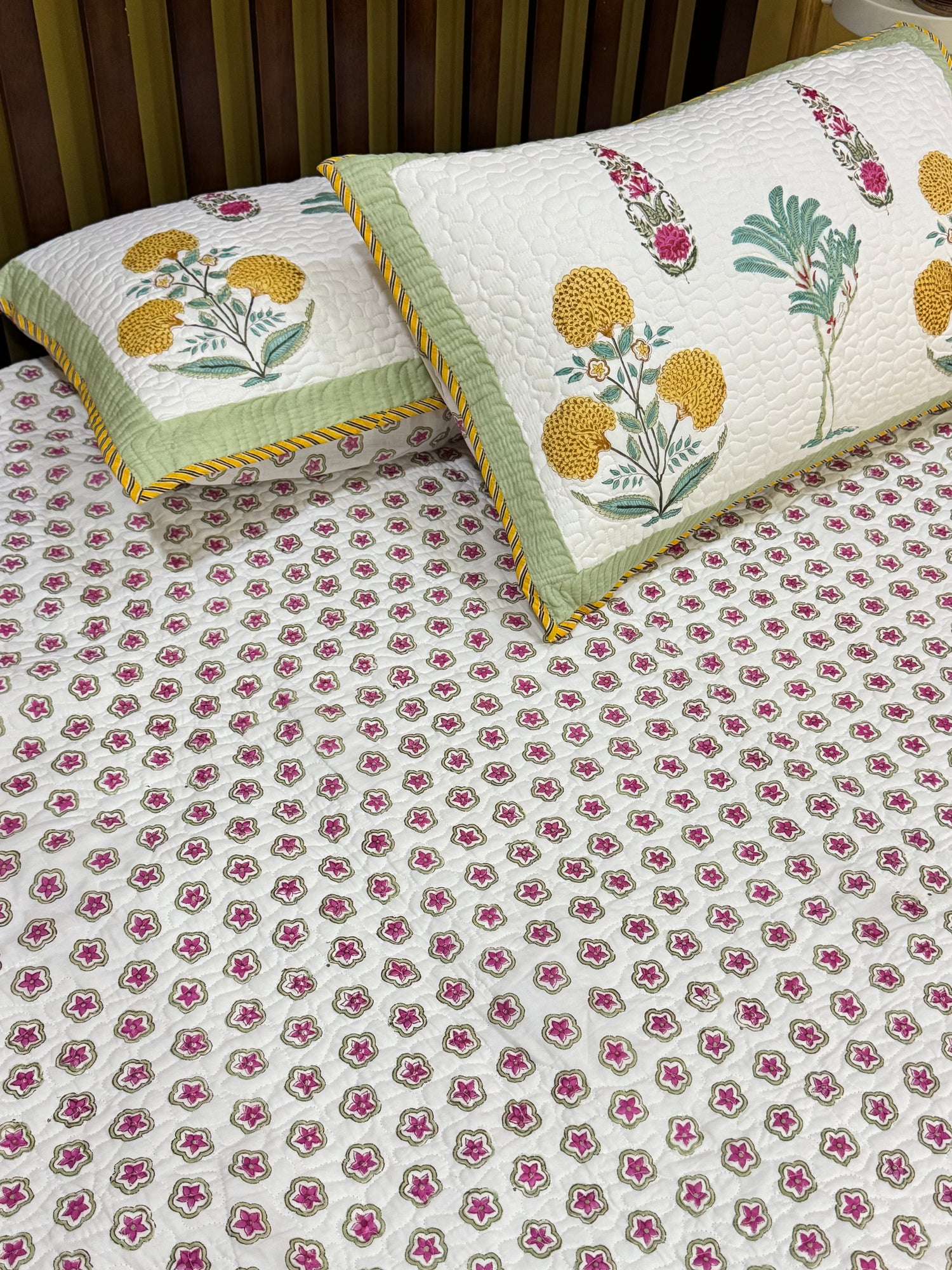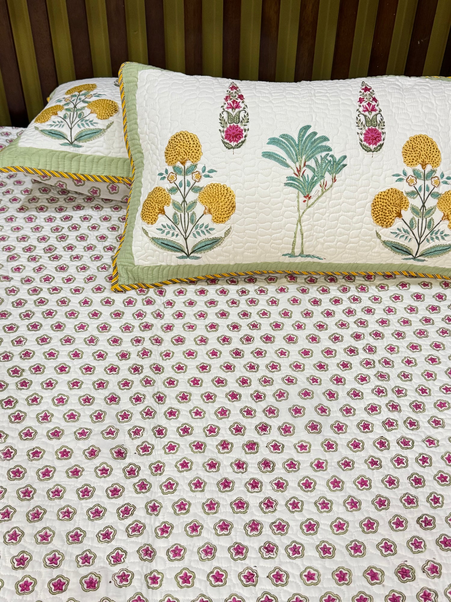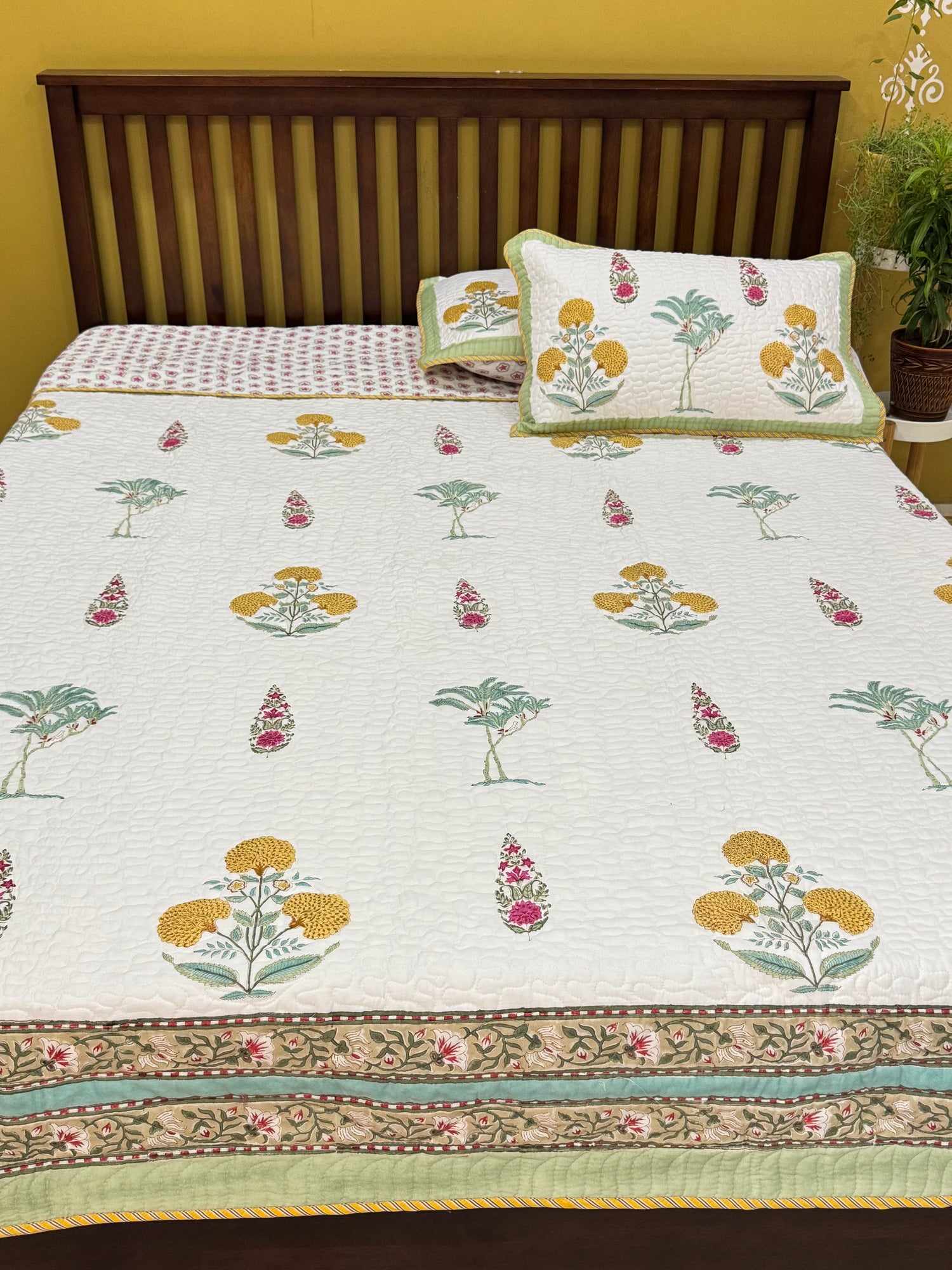 Wake up in your bedroom with the gentle beauty of this mustard, leafy green and soft pink against the light white base of this king-size hand block printed quilted bedcover. Hand block printed with cute floral butis on one side and dainty botanical motifs on the other side, adding a fresh garden feel to your bedroom.