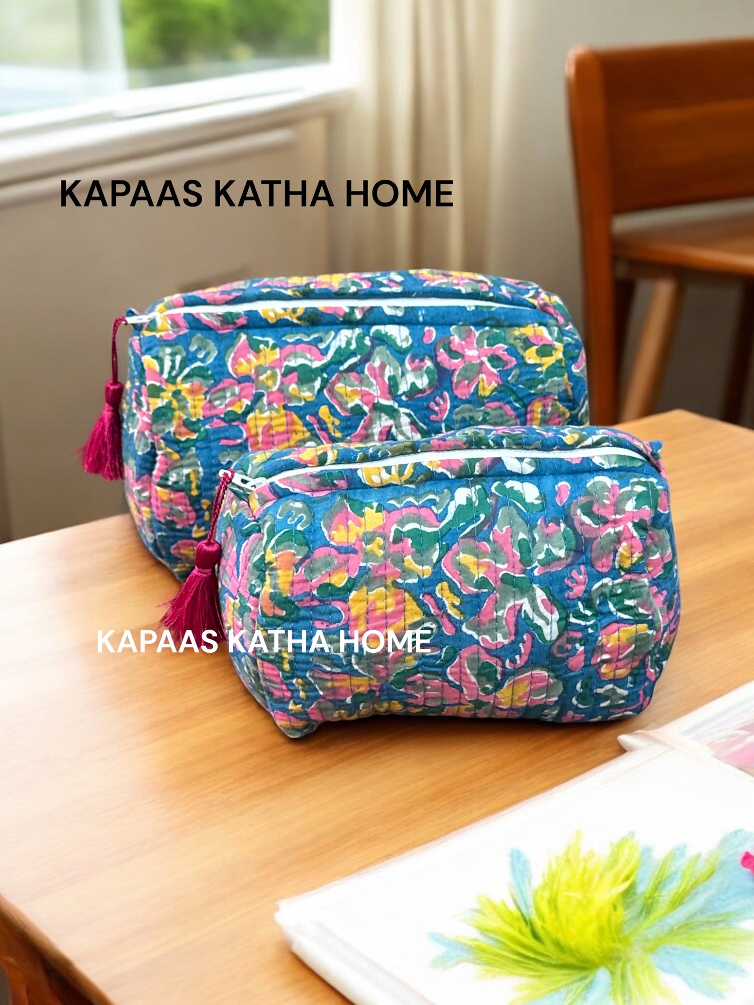 Multi-purpose handblock printed cotton fabric quilted pouches with beaded tassels.