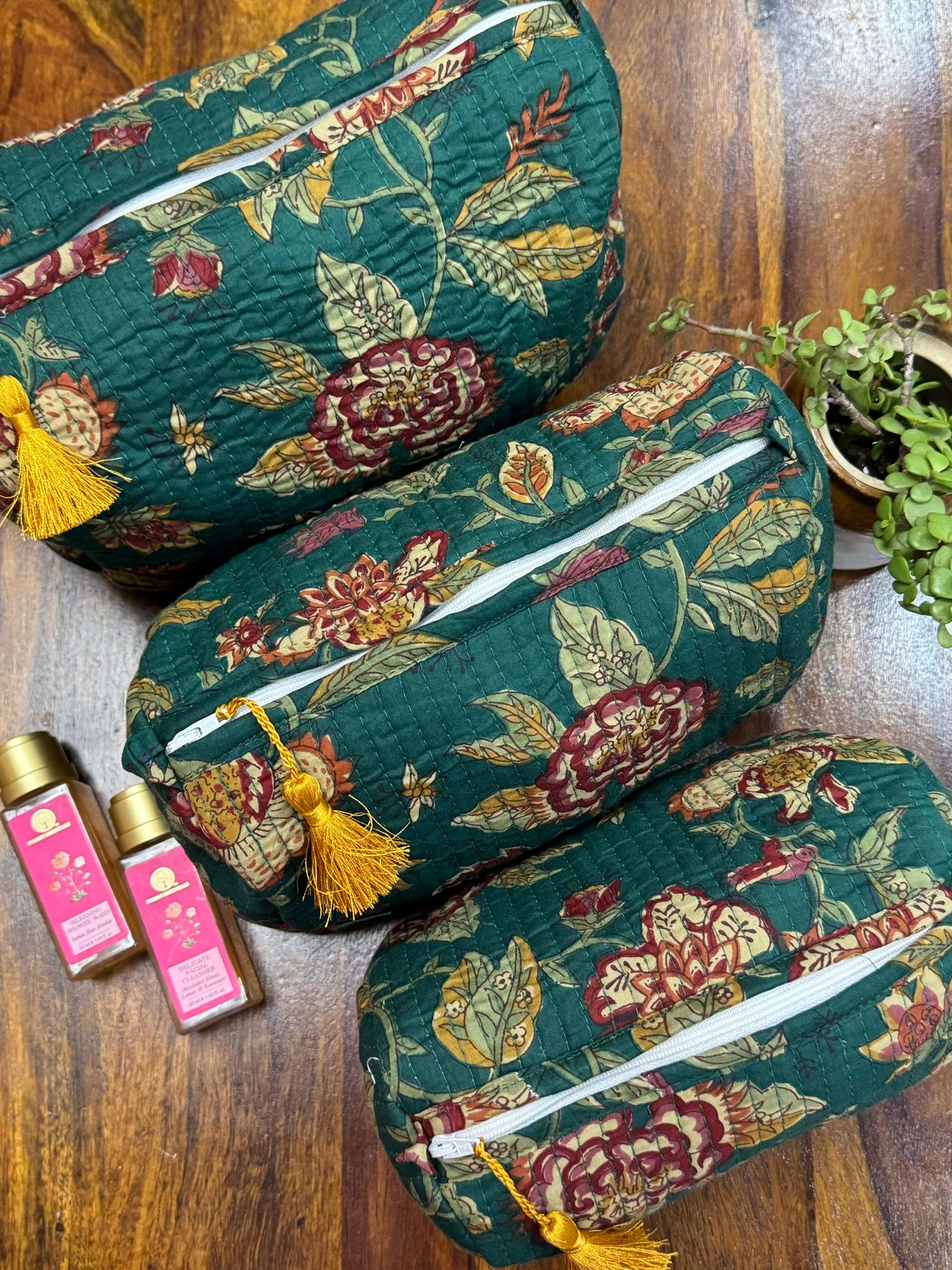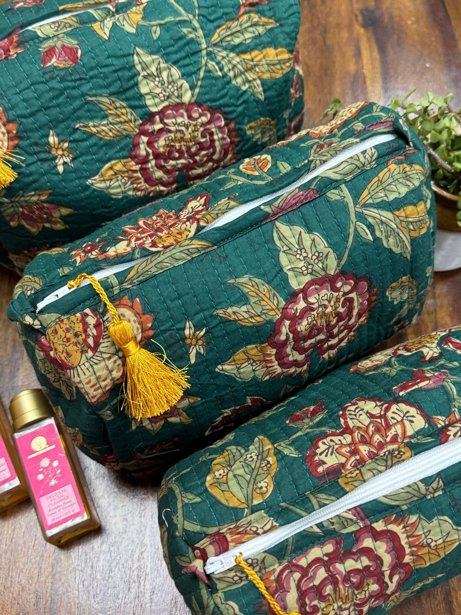 Multi-purpose hand-blockprinted cotton fabric cushioned pouches with beaded tassels.