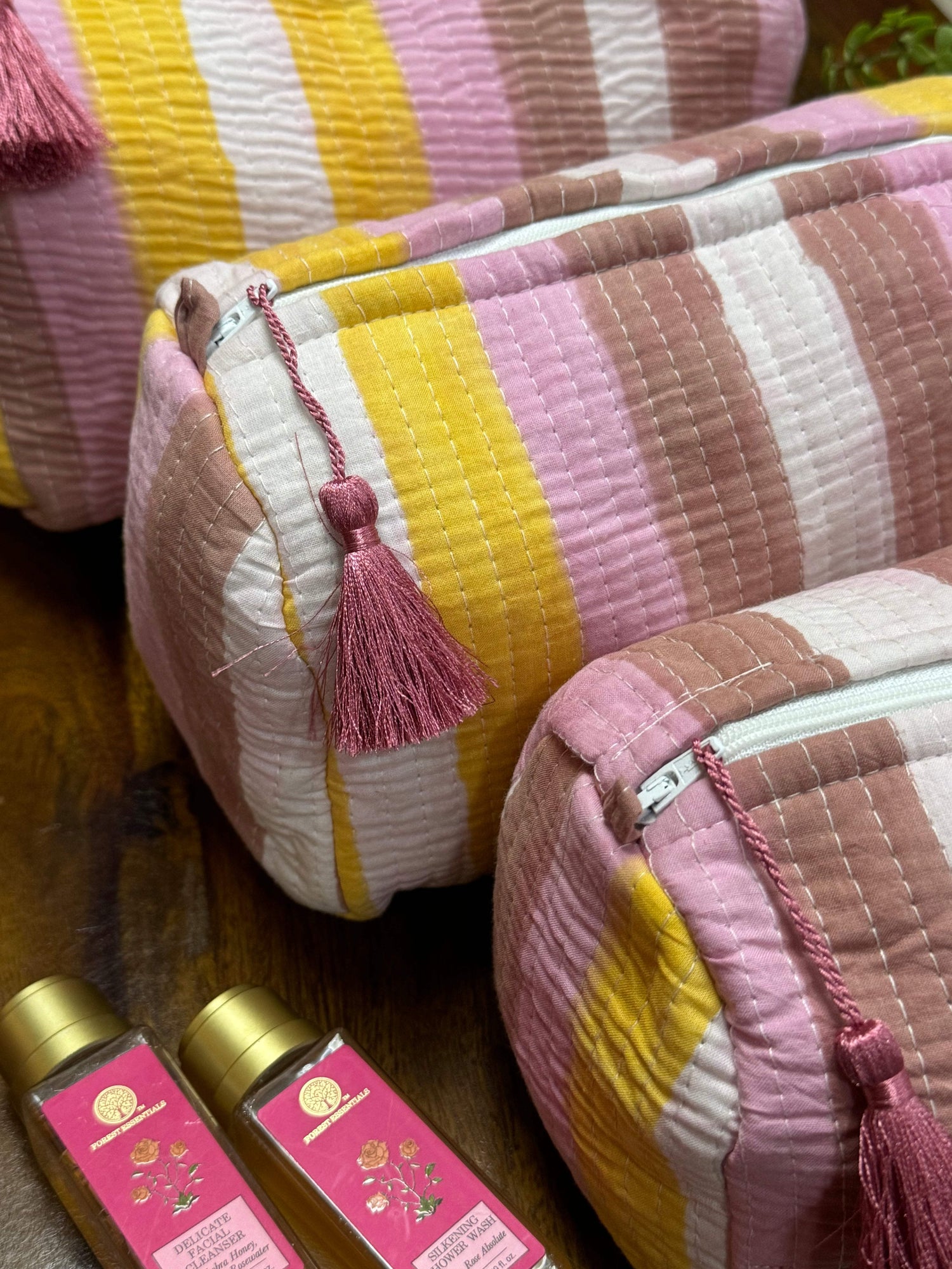 Multi-purpose hand-blockprinted cotton fabric cushioned pouches with beaded tassels.