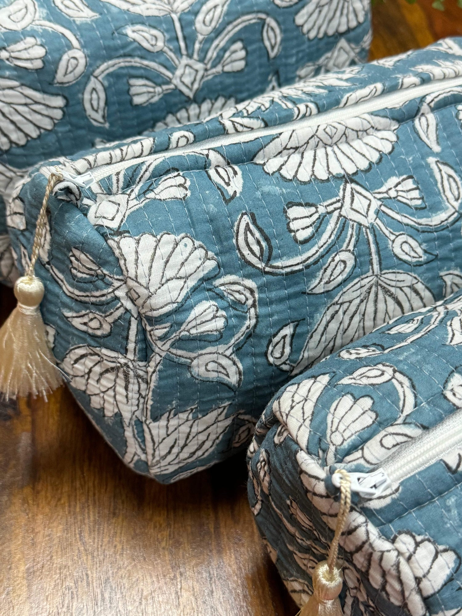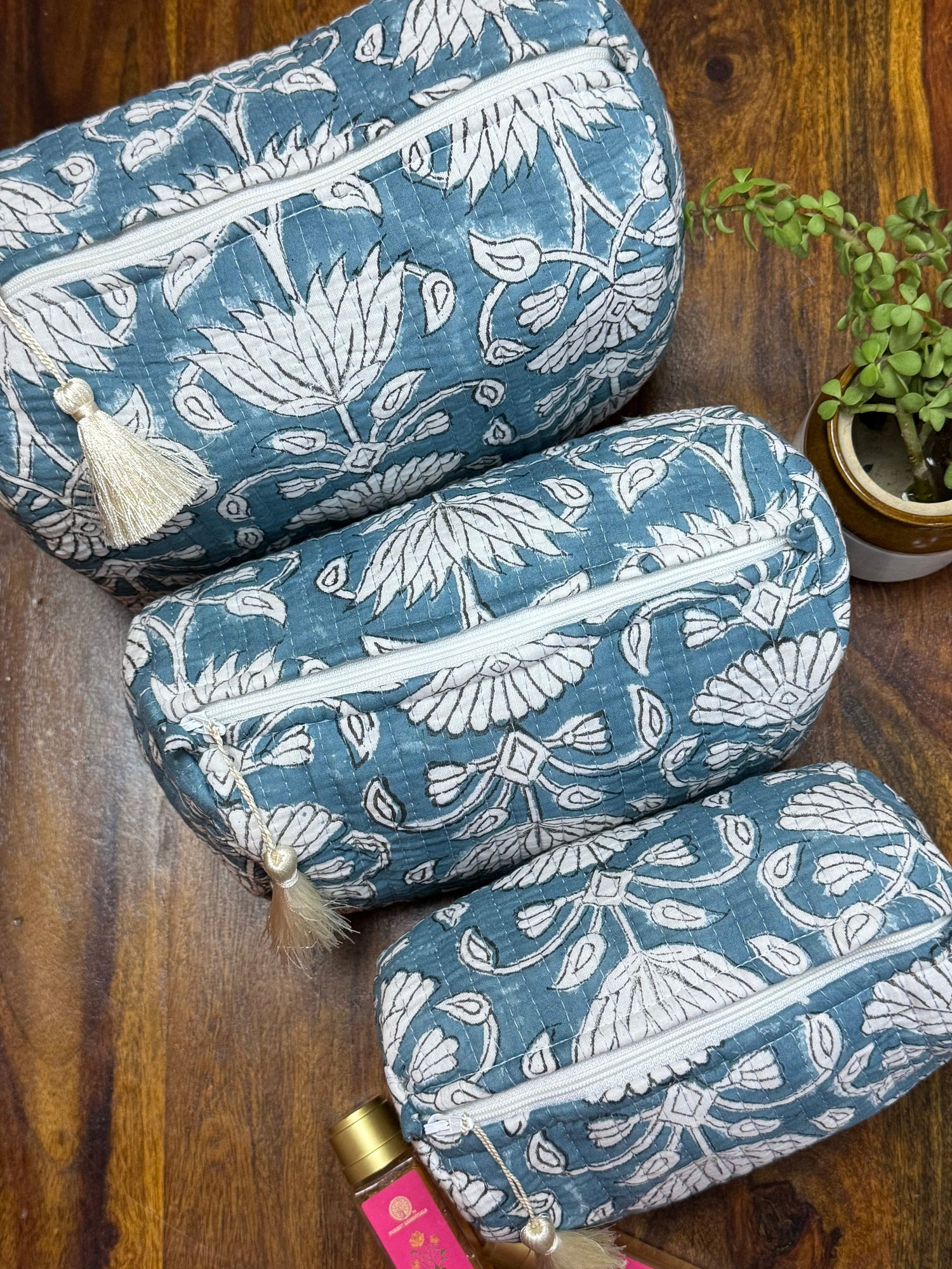 Multi-purpose hand-blockprinted cotton fabric cushioned pouches with beaded tassels.