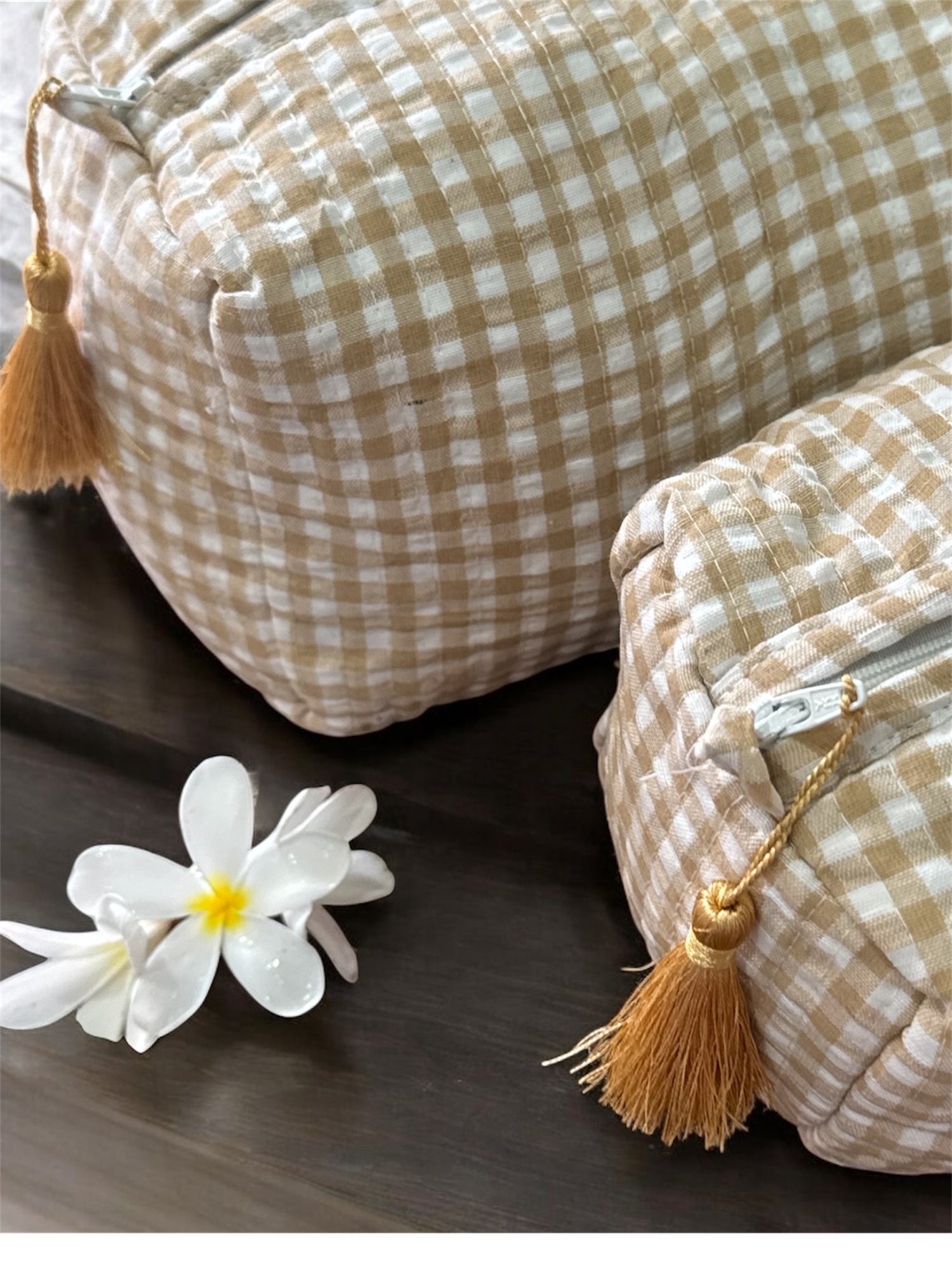 Multi-purpose hand-blockprinted cotton fabric cushioned pouches with beaded tassels.