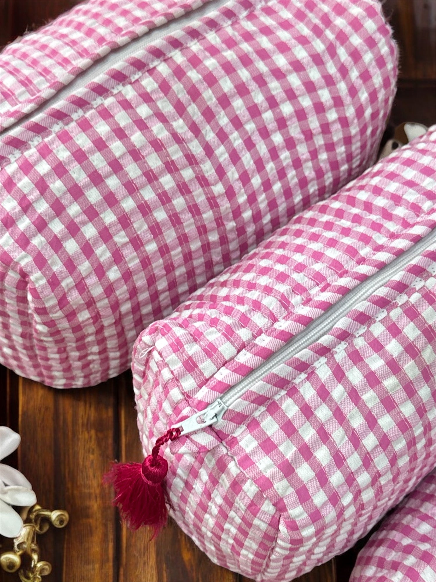Multi-purpose hand-blockprinted cotton fabric cushioned pouches with beaded tassels.