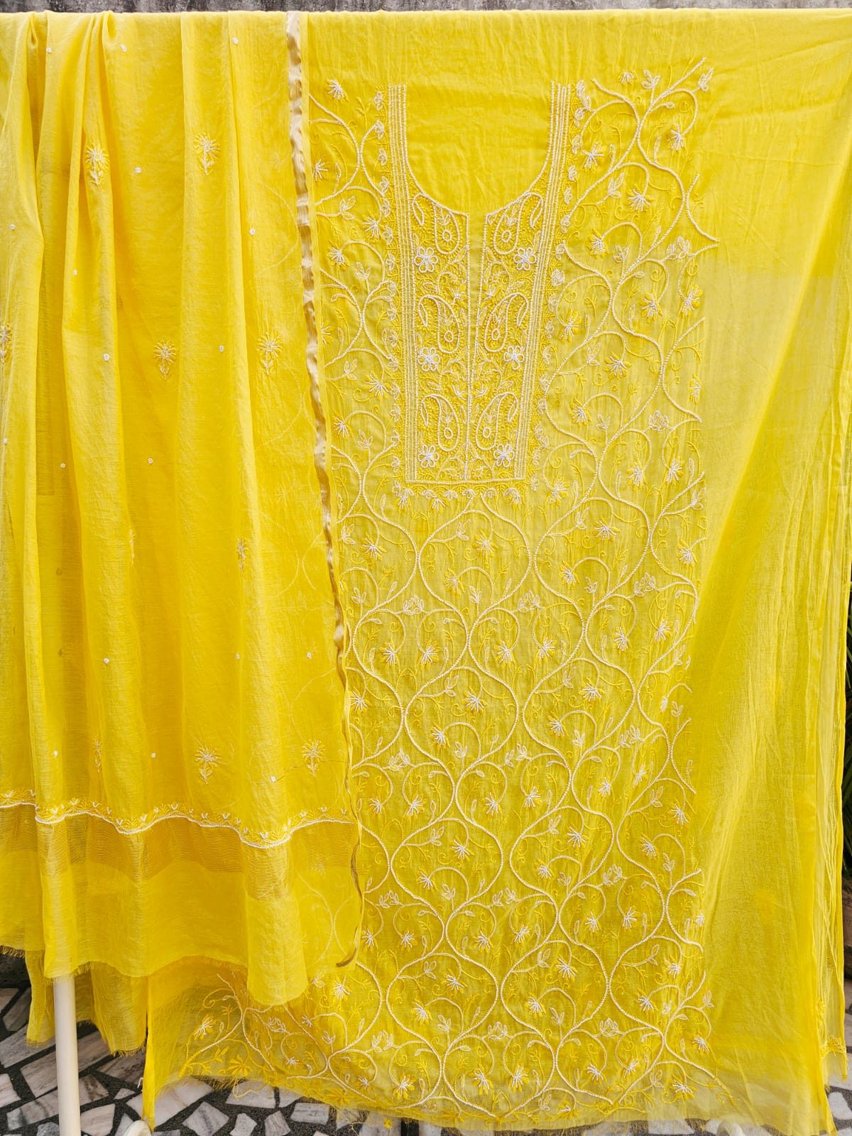 Two-piece unstitched Lucknowi Chikankari, bead and Cutdana hand embroidery suit set. Heavy Jaal hand embroirderd on entire front of the suit fabric.