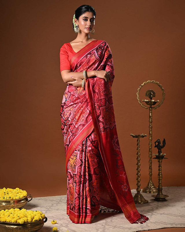 Sophisticated Handloom Brown and Red Mulberry Silk Ikat Patola Saree with Animal Motifs