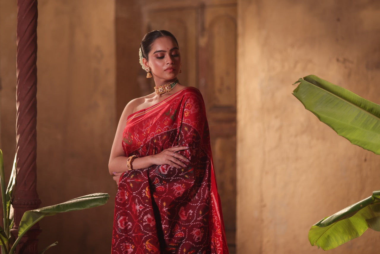 This Handloom Brown and Red Pure Ikat Patola Saree shows elegance and sophistication. Woven with pure Mulberry Silk in vibrant hues using the single ikat technique, it showcases intricate animal motifs that enhance its charm.