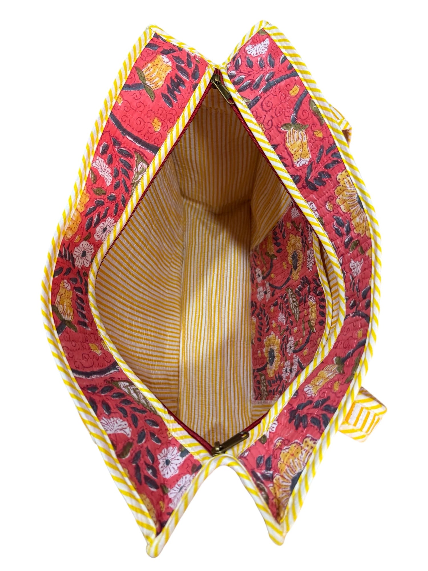 The artistic detailing continues inside the bag, where coordinated prints add harmony and visual delight to the design. Each floral detail is hand blockprinted, giving the tote a distinctive artisan feel. Ideal for those who love expressive accessories, it brings together color, convenience, and handcrafted charm in one striking everyday essential.
