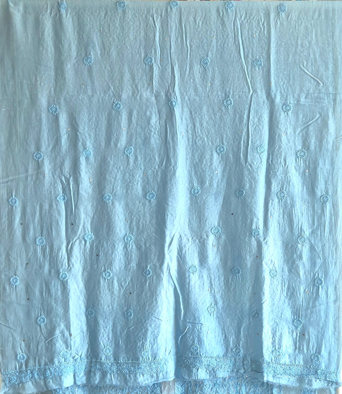 This elegant Chikankari and Mukaish hand embroidered piece on Mulchanderi is one to cherish. These Fabrics have small boota on the back and sleeves with small border.