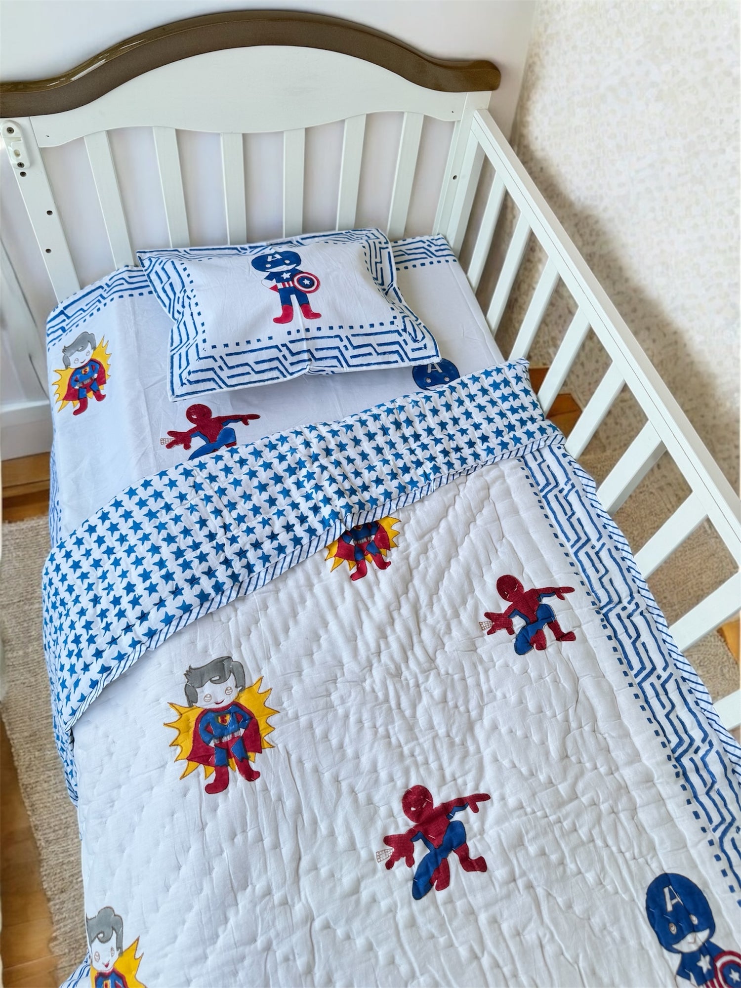 Super Heroes- Baby Cot Bedding (cot sheet, quilt, pillowcase)