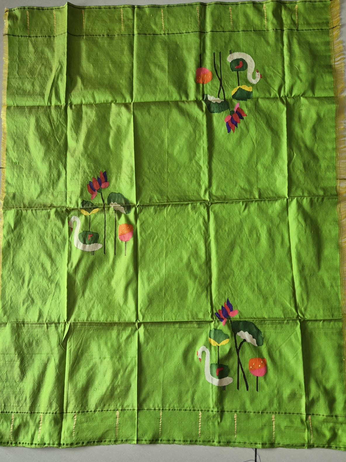 A handloom pure silk Paithani blouse piece in fresh parrot green, adorned with traditional motifs of swans, lotuses, and leaves in vibrant resham weaves. This timeless piece celebrates nature’s grace while adding a regal charm to festive attire.