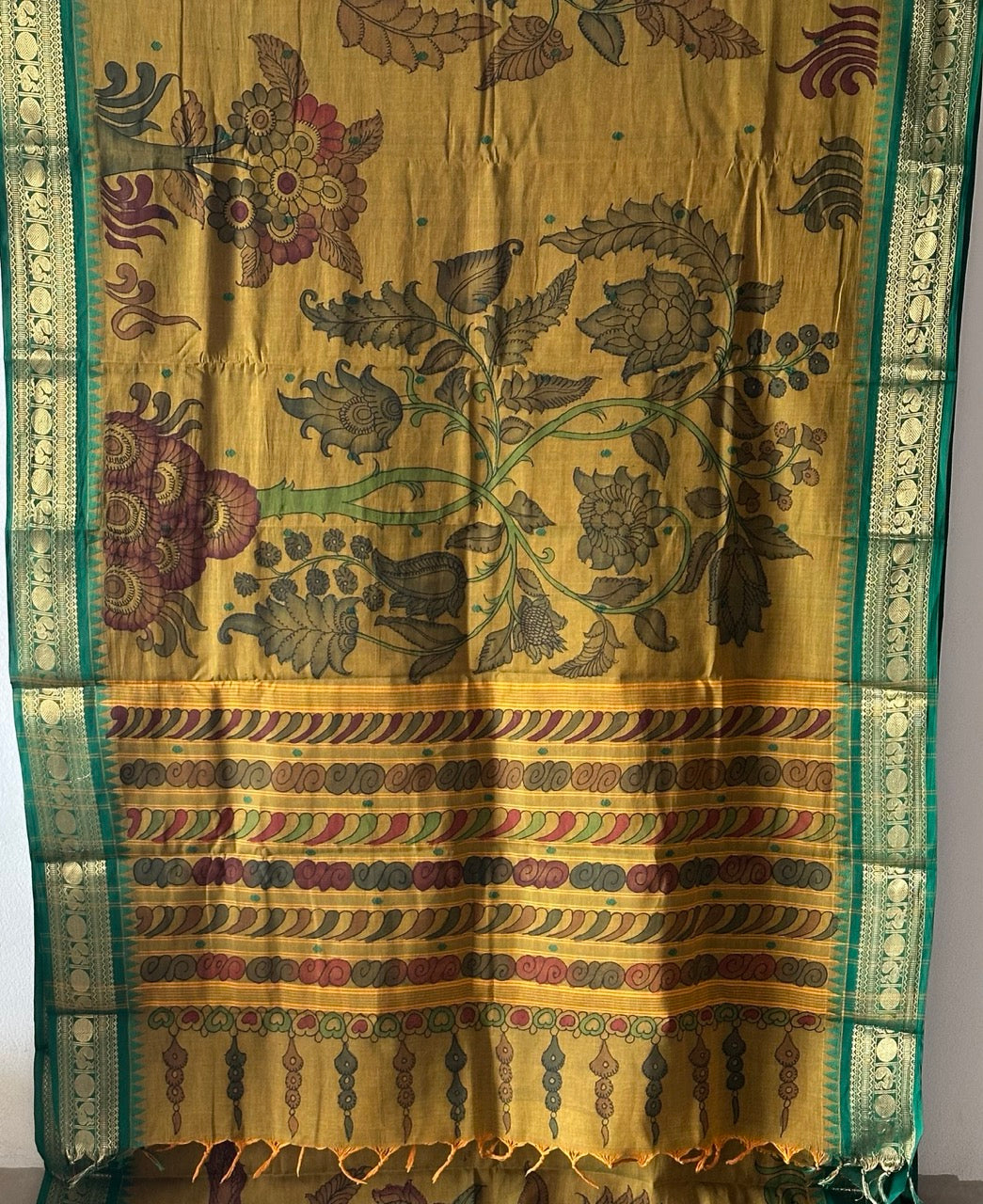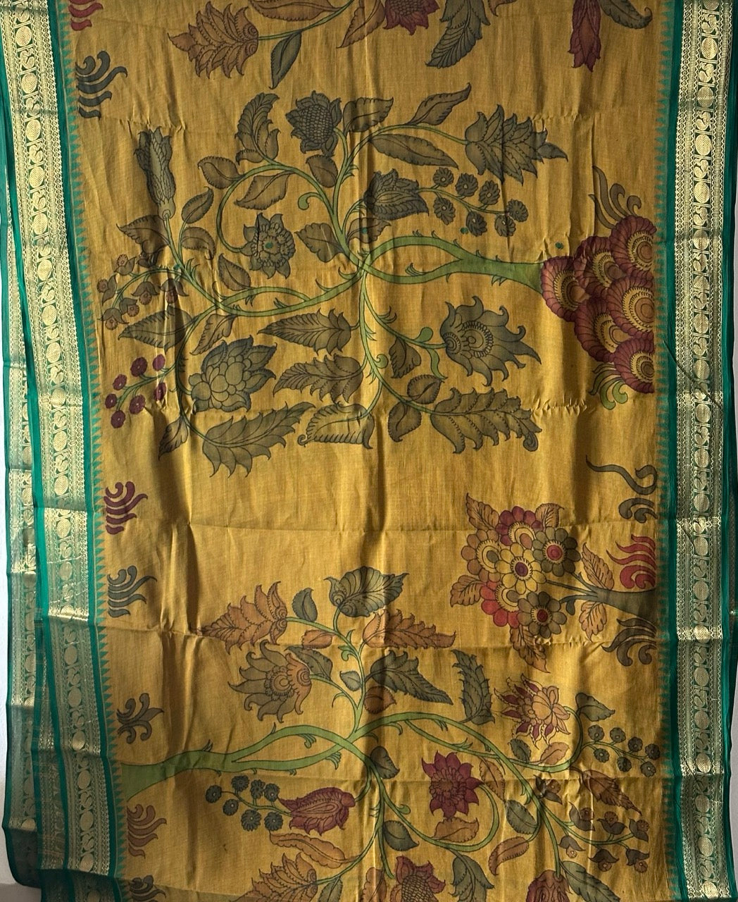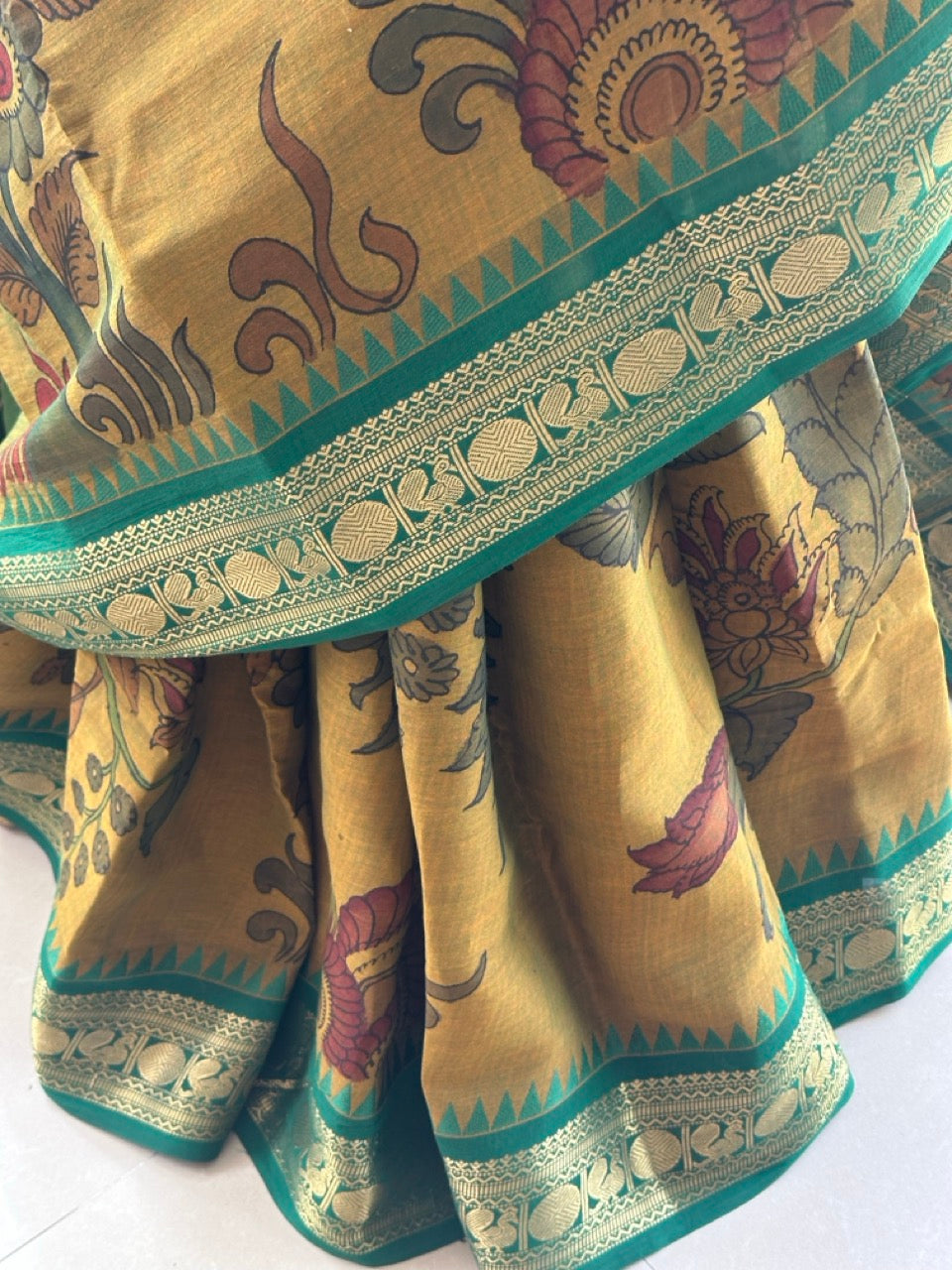 We meticulously capture these nuances in all our images. Due to the nature of the craft and the colors employed, Kalamkari is prone to bleeding. The 17-23 step Kalamkari process results in certain variations in the zari.