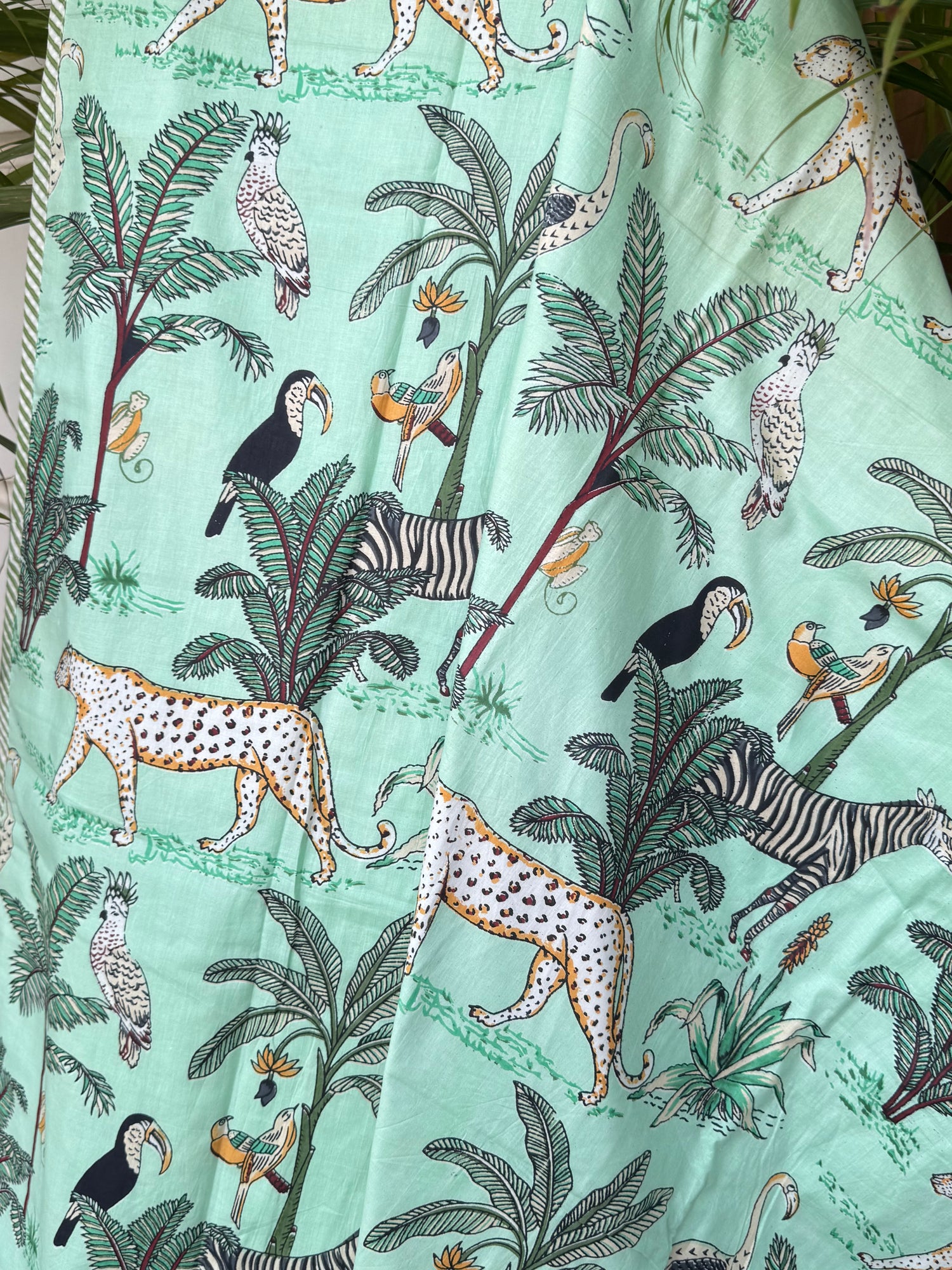Transform your little explorer’s room into a wild jungle escape with our Layered Blanket (Dohar) featuring vibrant cheetahs, playful zebras, and swaying palm trees printed on a soft mulmul cotton surface with a cozy flannel core. The reversible design showcases the same safari motif on a complementary base, giving you two fun looks in one blanket. Crafted from sustainable, eco‑friendly mulmul cotton and colored with azo‑free, skin‑friendly dyes, this dohar is lightweight, breathable, and gentle on delicate skin, making it perfect for summer and year‑round use in warm climates.