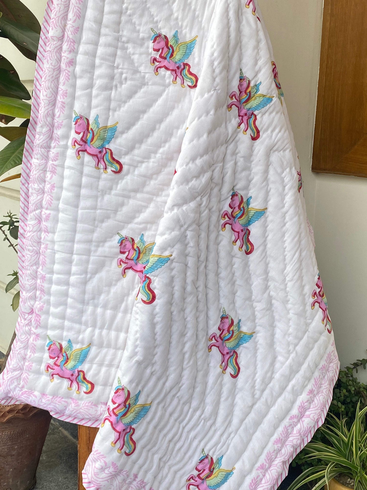 Unicorn Kids Quilt Handblock Printed - Baby Size (40*40 inches) 0-2 yrs is backordered and will ship as soon as it is back in stock.