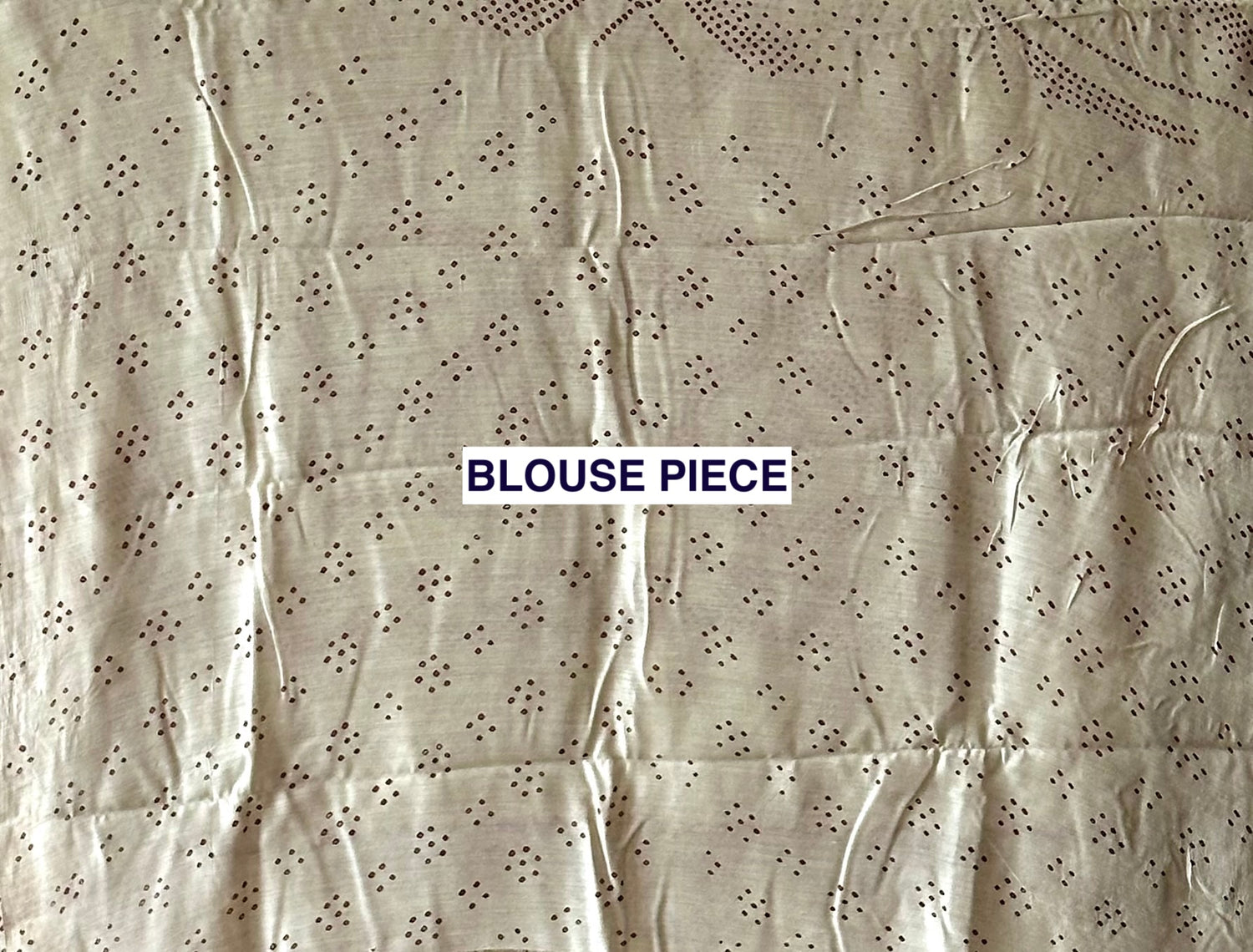 This elegant Munga silk Bandhani saree exudes quiet luxury with its beige base delicately dotted in traditional red Bandhani motifs. The subtle geometric patterns lend it a refined charm. A perfect pick for timeless, graceful celebrations.